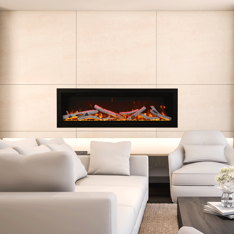 Amantii Symmetry Smart Indoor / Outdoor WiFi-enabled electric fireplace, featuring a multi-function remote control, multi-speed motor, and a 10 piece birch log set