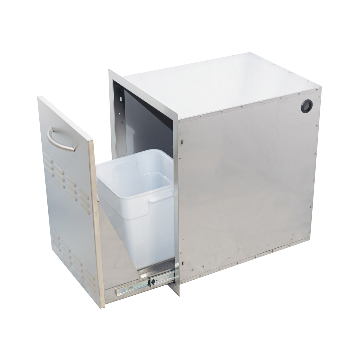 The Jackson Grills Built-In Trash Bin Holder is designed with sturdy drawer glides that allow it to easily pull outwards and offer convenient access to the hidden trash receptacle. The package now includes a PVC trash container to ensure a secure waste disposal solution.