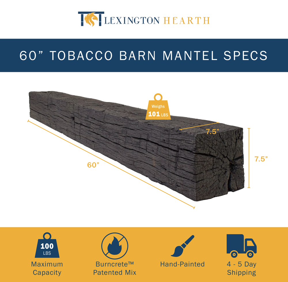 The Lexington Hearth Tobacco Barn mantel is molded directly from a 7.5” x 7.5” barn timber to authentically reproduce the beautiful seasoning imparted to the wood over time. Features include hand-hewn tool marks, deep checking, knots, and growth rings visible on the ends.