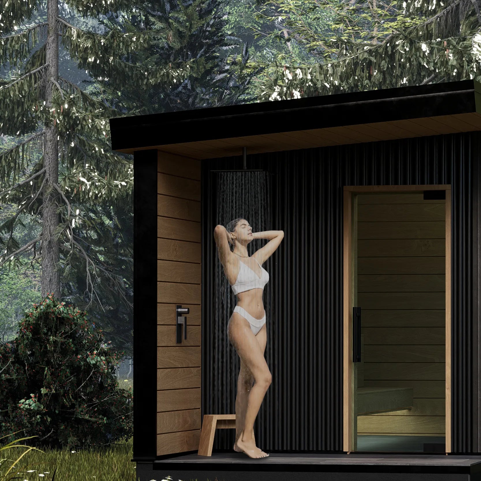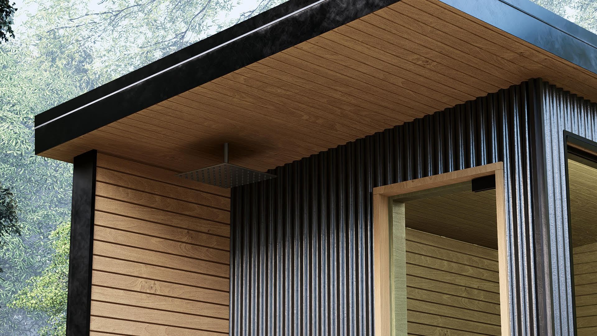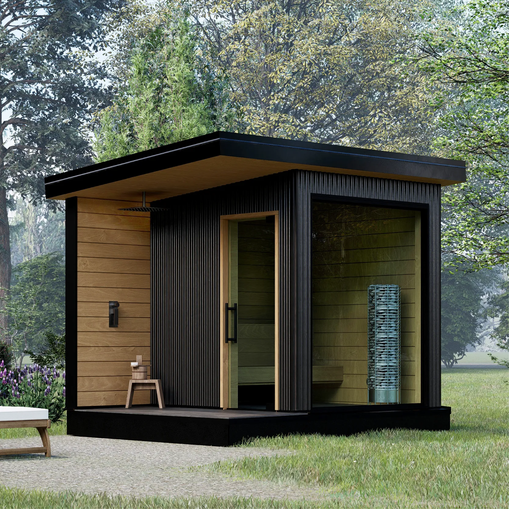Expertly milled West Coast cedar forms seamless walls and floors, capped with a 22-gauge black-metal roof that withstands hail, wind and snow.